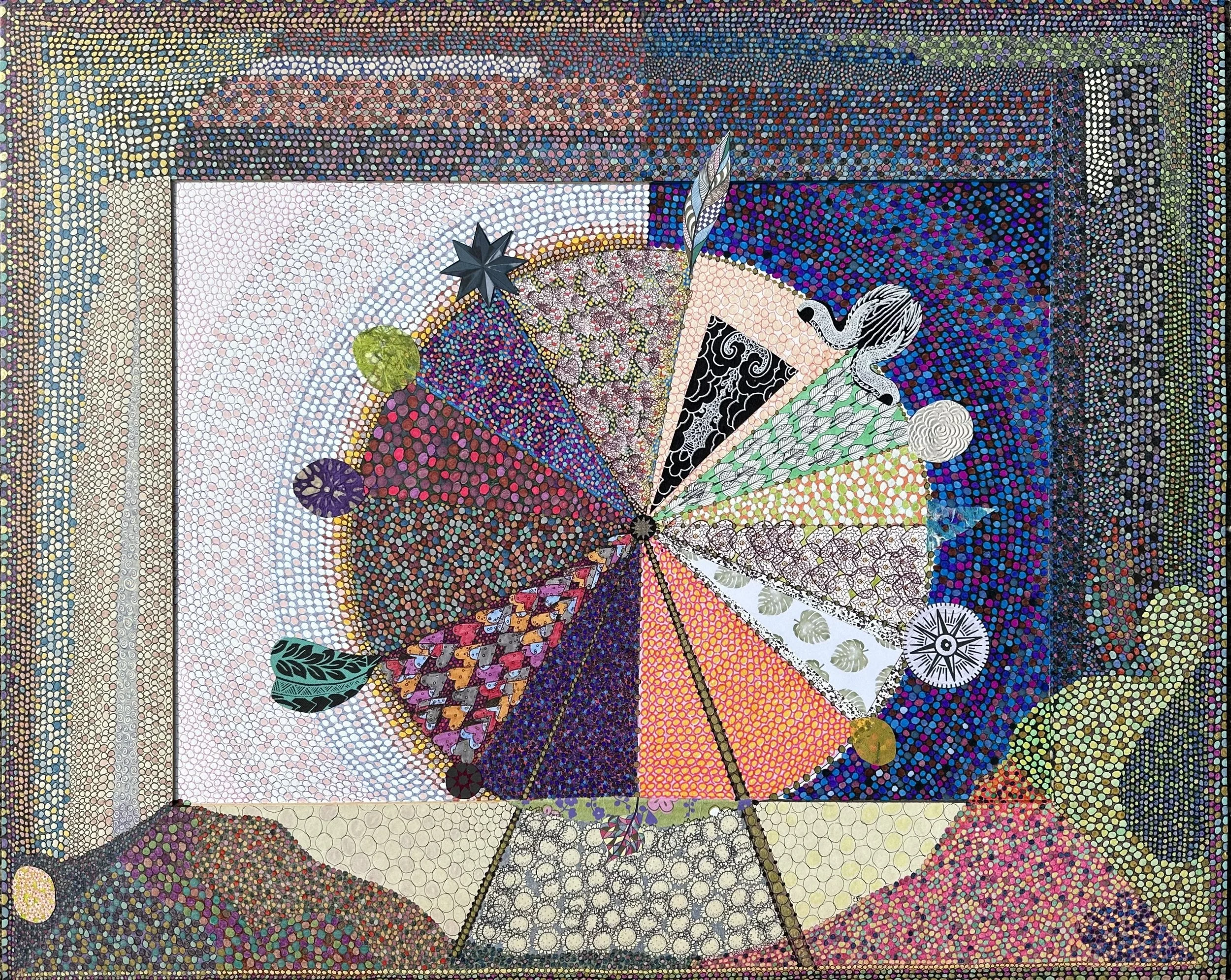 Beckman-Spector’s work reflects a thoughtful exploration of interconnectedness and complexity. Working primarily in pen and ink, she builds richly textured compositions through layers of small dots and repetitive forms. Her drawings balance contrasts—light and dark, micro and macro, stillness and energy—inviting viewers into a contemplative visual experience that transforms complexity into a sense of beauty and quiet joy.